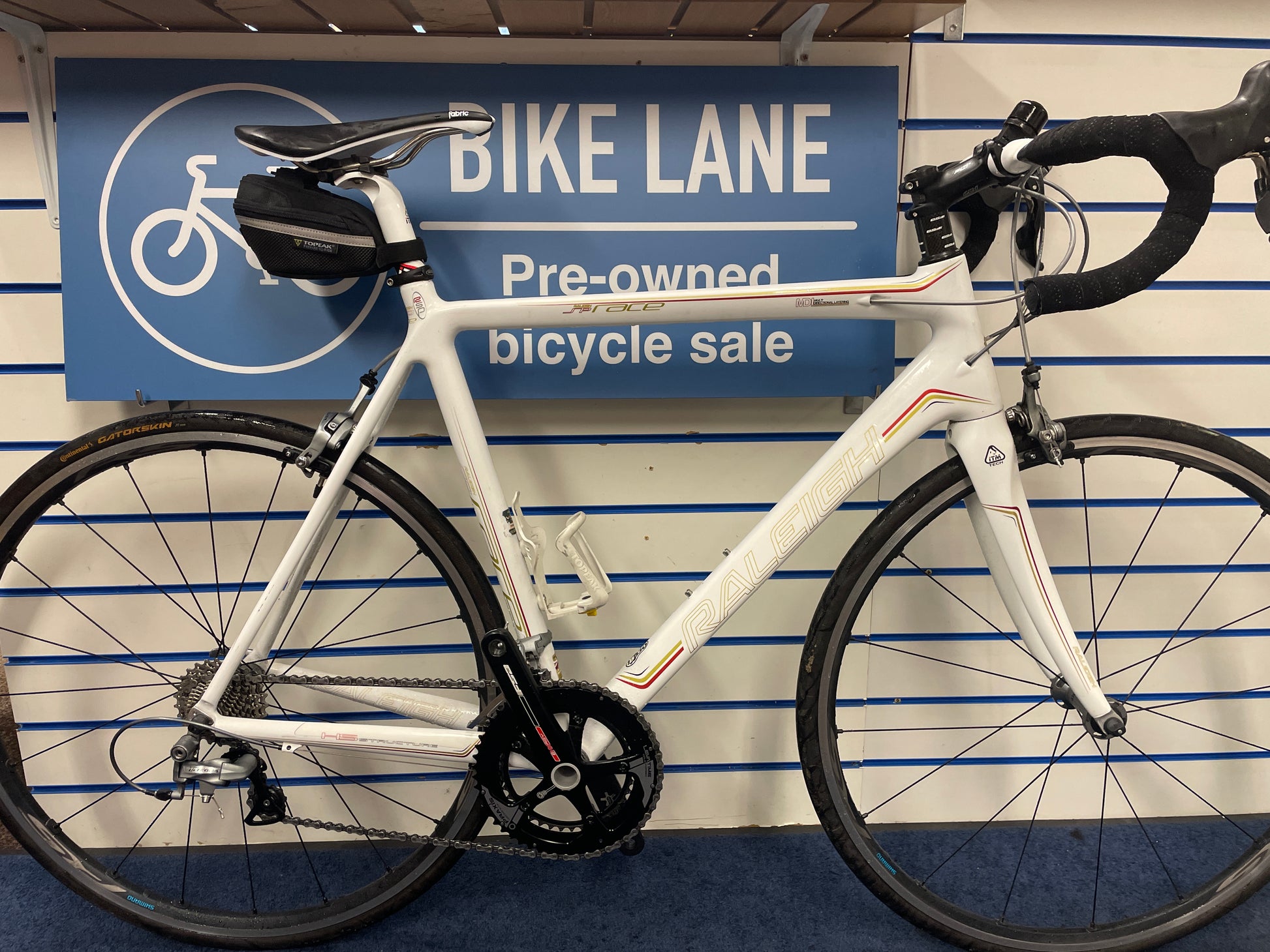 Raleigh Full Carbon 58cm SP Race Road Bike, Ultegra 10 speed groupset inc wheels Praxis chainrings, FSA chainset bb30 bearingfit, Pro Stem, Fabric seat, rear saddle bag, new tape fizik just fitted nice winter training bike. Gator Skin 25c tyres.